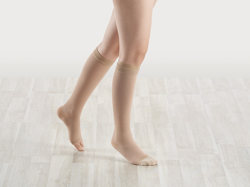 Prvo smo obukli patentiranu, inovativnu čarapu sa pamučnim vlaknima do kože sa pritiskom skočnog zgloba od 20 mmHg. Spoljni sloj je napravljen od glatke tkanine. Čarapa fiksira oblogu rane na potkolenici, štiti osetljivi deo noge i omogućava blagu kompresiju noću. Takođe pojednostavljuje nošenje gornje čarape, koja je veoma uspešna terapijska kompresivna čarapa SIGVARIS Traditional sa kompresijom od 23-32 mmHg. Testirana je u više od 130 kliničkih studija.